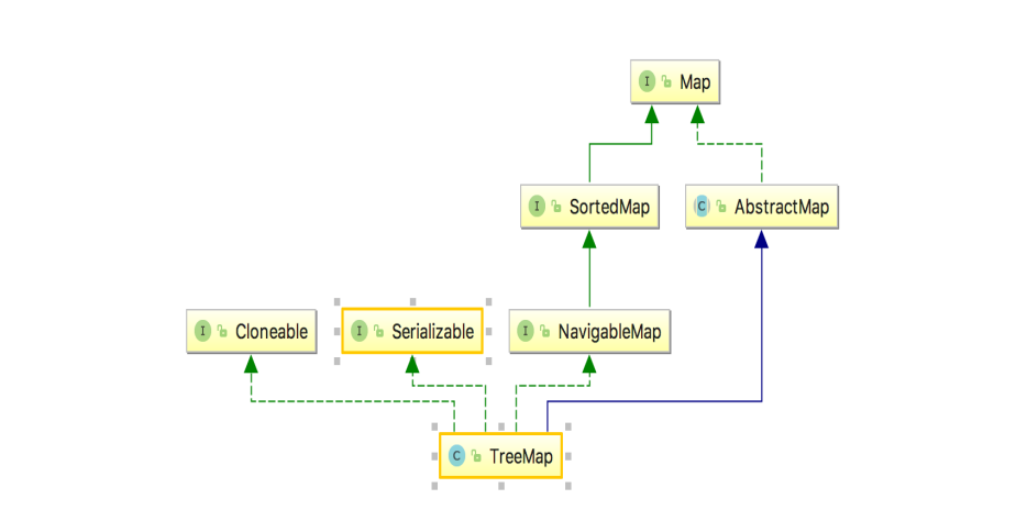 二、TreeMap的继承关系 下面先让我们来看一下TreeMap的继承关系,对它有一个大致的了解: 可以看到,除了在之前HashMap里常见的继承类和接口以外,TreeMap实现了NavigableMap接口,而NavigableMap继承自SortedMap,由名字可以看出这是一个用来实现排序的接口,这也是TreeMap能够实现排序的原因