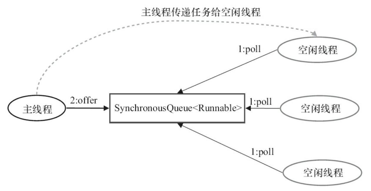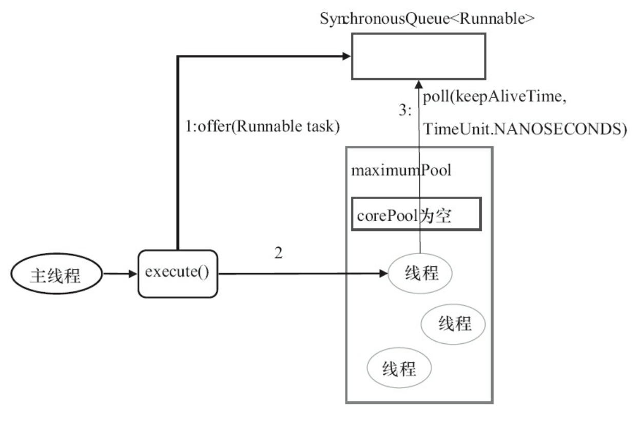 - 首先执行SynchronousQueue.offer(Runnable task).如果当前maximumPool中有空闲线程正在执行SynchronousQueue.poll(keepAliveTime,TimeUnit.NANOSECONDS),那么主线程执行offer操作与空闲线程执行的poll操作配对成功,主线程把任务交给空闲线程执行,execute()方法执行完成;否则执行下面的步骤2