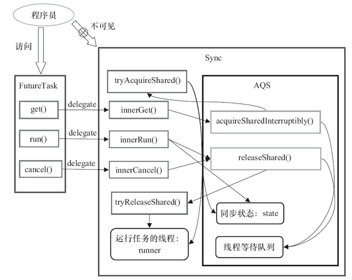 AQS被作为”模板方法模式”的基础类提供给FutureTask的内部子类Sync,这个内部子类只需要实现状态检查和状态更新的方法即可,这些方法将控制FutureTask的获取和释放操作.具体来说,Sync实现了AQS的tryAcquireShared(int)方法和tryReleaseShared(int)方法,Sync通过这两个方法来检查和更新同步状态
