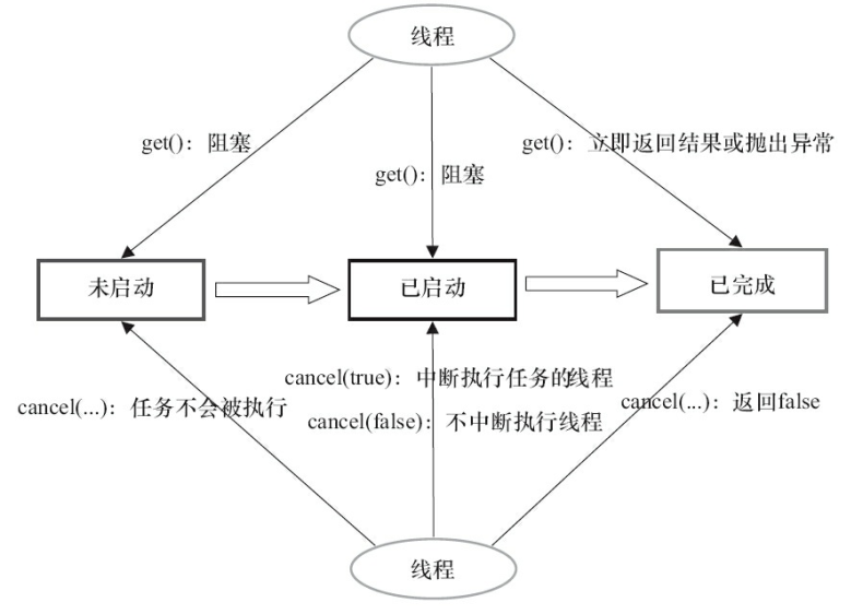 - 已完成:FutureTask.run()方法执行完后正常结束,或被取消(FutureTask.cancel(…)),或执行FutureTask.run()方法时抛出异常而异常结束,FutureTask处于已完成状态