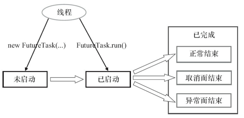 - 已启动:FutureTask.run()方法被执行的过程中,FutureTask处于已启动状态