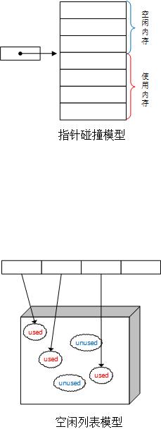 - 如果Java堆中内存是绝对规整的,所有用过的内存都放在一边,空闲的内存放在另一边,中间放着一个指针作为分界点的指示器,那所分配内存就仅仅是把那个指针指向空闲那边挪动一段与对象大小相等的距离,这种分配方式称为”指针碰撞”.