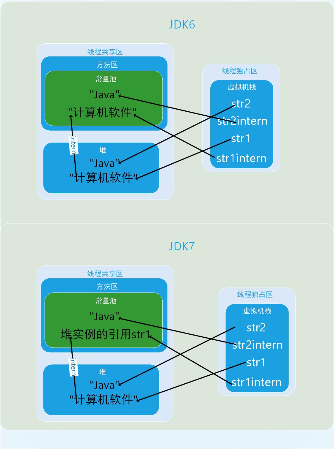 - JDK7中的intern实现不会再复制实例,只是在常量池中记录首次出现的实例引用,因此intern()返回的引用和由StringBuilder创建的那个字符串实例是同一个.对str2比较返回false是因为”java”这个字符串在指向StringBuilder.toString之前已经出现过,字符串常量池已经有它的引用,不符合”首次出现”的原则,而”计算机软件”这个字符是首次出现则true